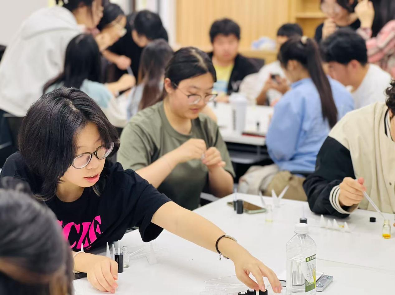 在DIY调香体验环节,同学们在王老师的指导下,积极动手挑选精油、调配比例,创造属于自己的专属香氛。“玫瑰+焚香”“薰衣草+薄荷”等新奇配方不断涌现。同学们在调配过程中充分体验到了探索与创造的乐趣,释放了个性魅力,找到与自己心灵契合的香气。