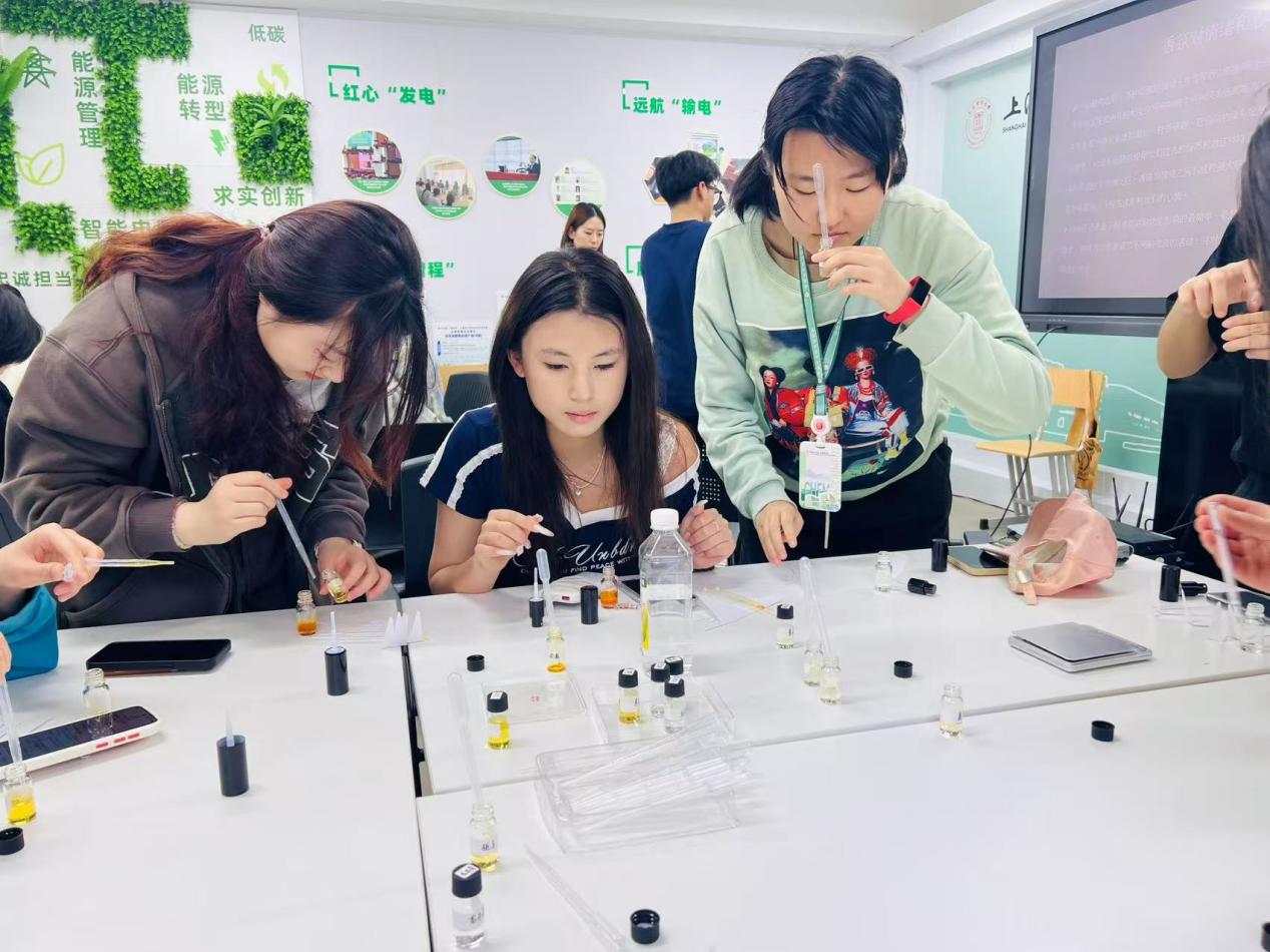 在DIY调香体验环节,同学们在王老师的指导下,积极动手挑选精油、调配比例,创造属于自己的专属香氛。“玫瑰+焚香”“薰衣草+薄荷”等新奇配方不断涌现。同学们在调配过程中充分体验到了探索与创造的乐趣,释放了个性魅力,找到与自己心灵契合的香气。