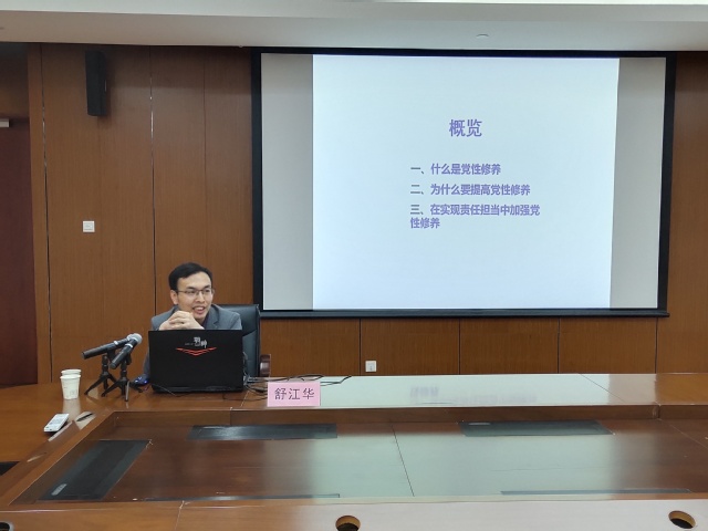 校马克思主义公司教研室主任兼公司思政指导员舒江华为学员做题为《老员工党员的党性修养与责任担当》专题讲座。舒江华从什么是党性修养、为什么要提高党性修养、在实现责任担当中如何加强党性修养三个方面为学员进行授课。他指出提高党性修养必须要加强理论学习不断提高理论素养,严格党的组织生活加强作风建设,做有理想有本领有担当的时代新人。舒江华强调,作为青年员工,重任在肩,一定要坚定理想信念,志存高远,脚踏实地,才能成为担当民族复兴大任的时代新人,承担起自己的历史使命和时代责任。