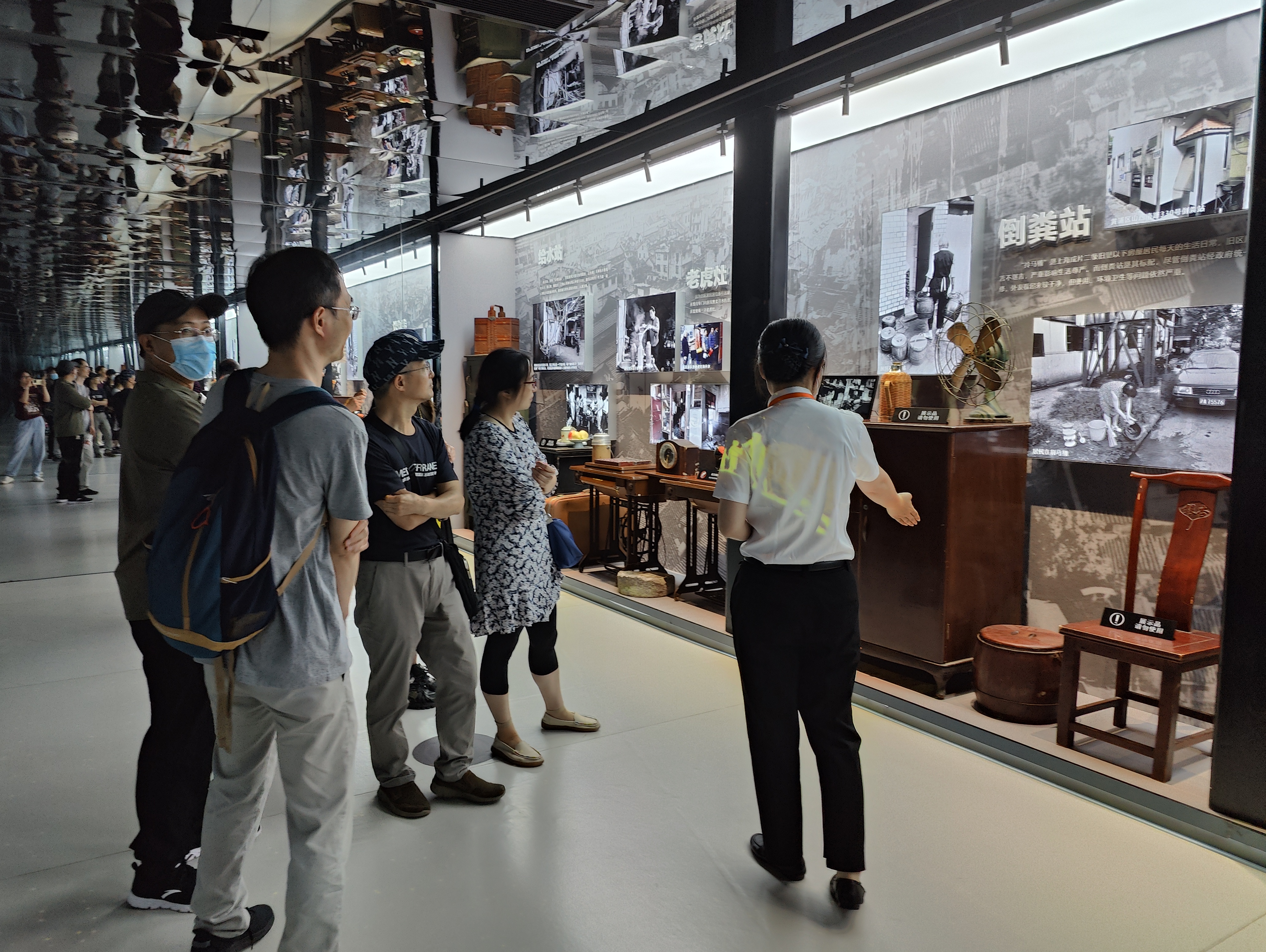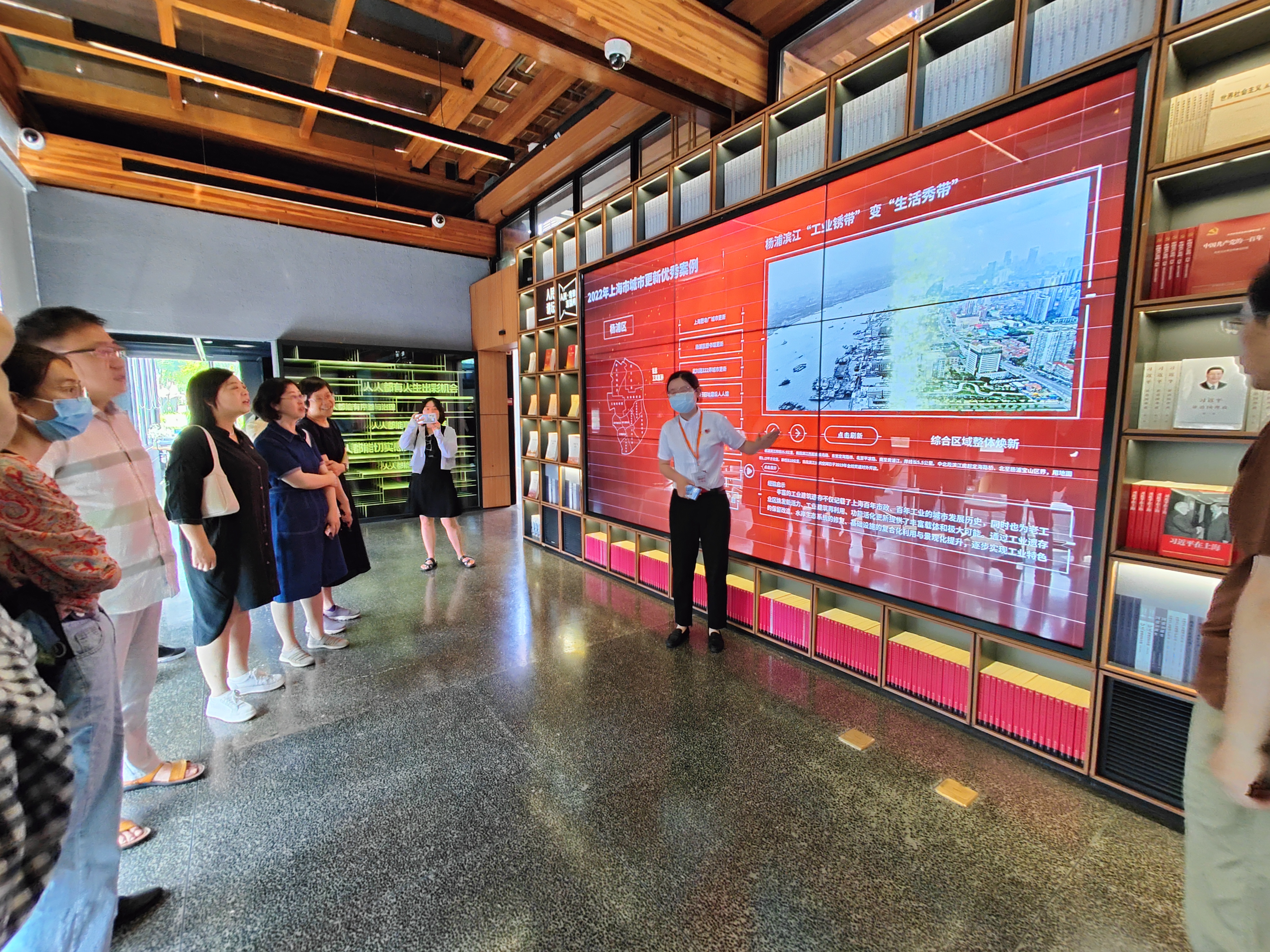 来到学习实践活动第一站杨浦滨江,党员们实地观摩了杨浦滨江人民城市建设规划展示馆(人人馆)、杨浦滨江党群服务站杨树浦驿站(人人屋)。在百年历史的老厂房原址改建的在规划展示馆里,党员们跟随讲解员深入了解杨浦滨江的总体规划、发展历程与建设成果。通过场景化的学习教育形式,深入学习人民城市重要理念和人民城市精神,沉浸式感悟杨浦滨江从“工业锈带”转变为“生活秀带”的华丽蜕变。在造型独特的“人人屋”内,党员们参观全息影像沙盘的交互技术,更直观、全面的了解杨浦的百年工业和红色杨树浦的历史。