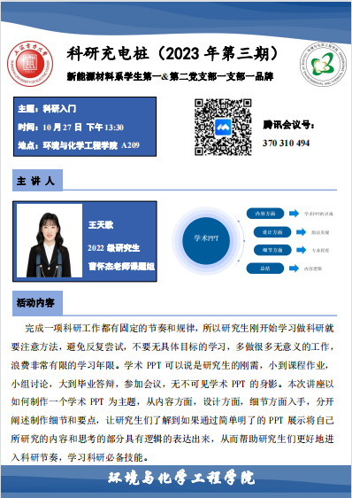 10月24日下午13:30,新能源材料系员工第一和第二党支部在公司A209会议室联合开展了支部特色活动—科研充电桩,本次活动邀请了两位国家奖学金获得者为大家开展了“科研入门”为主题的讲座。讲座由李海蒂主持,两个支部全体党员及部分研一同学参加。