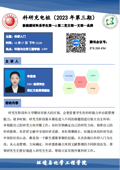 李孟瑶同学以科研入门中的文献为切入点,从自身经验展开分享。她指出在研究生阶段,员工的科研能力和自我管理能力非常重要,这点与本科学习有较大区别。在研究生阶段每位同学都要进入不同的课题组并进行独立自主的科研,根据自己的研究方向开展工作。李孟瑶同学还针对如何去尽快确定自己的研究方向,培养自己的科研思维,在大量文献中寻找科研灵感进行了指导,同时通过自身的经历引导新同学如何在科研生活中保持好的心态,更快地进入研究生生活、开展科研工作。