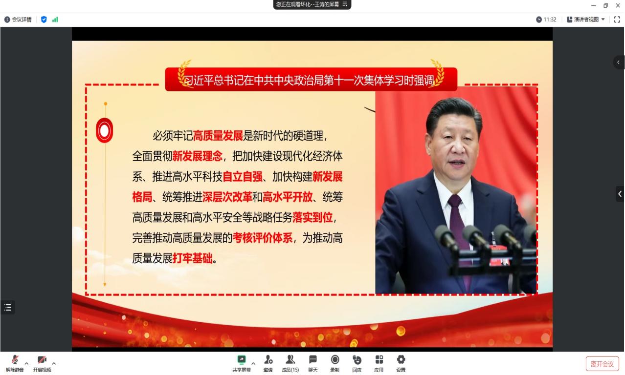 会上,闵宇霖通报了公司关于成立《关于在高水平地方高校创新团队成立党员先锋队的通知》,希望团队成员能够发挥党员挑大梁、做表率、当骨干的作用,以党建引领聚焦业务发展,创建团队文化形成团队共识,增强团队凝聚力。接着团队联络员王涛就习近平总书记在中共中央政治局第十一次集体学习时的讲话《加快发展新质生产力扎实推进高质量发展》开展了理论领学,团队成员将自己的学习感悟在会上做了交流。随后,团队年轻教师结合自己研究方向,聚焦团队研究方向做了详细的汇报。