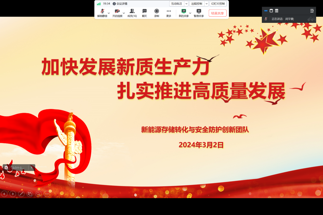 为进一步推进党建工作与业务工作深度融合,以高质量党建引领创新团队工作高质量发展,突出党建聚焦、业务聚焦,团队的内涵式发展3月2日新能源存储转化与安全防护创新团队召开党员先锋队理论学习研讨暨团队发展研讨会。团队全体成员参加,会议由团队队长闵宇霖主持。