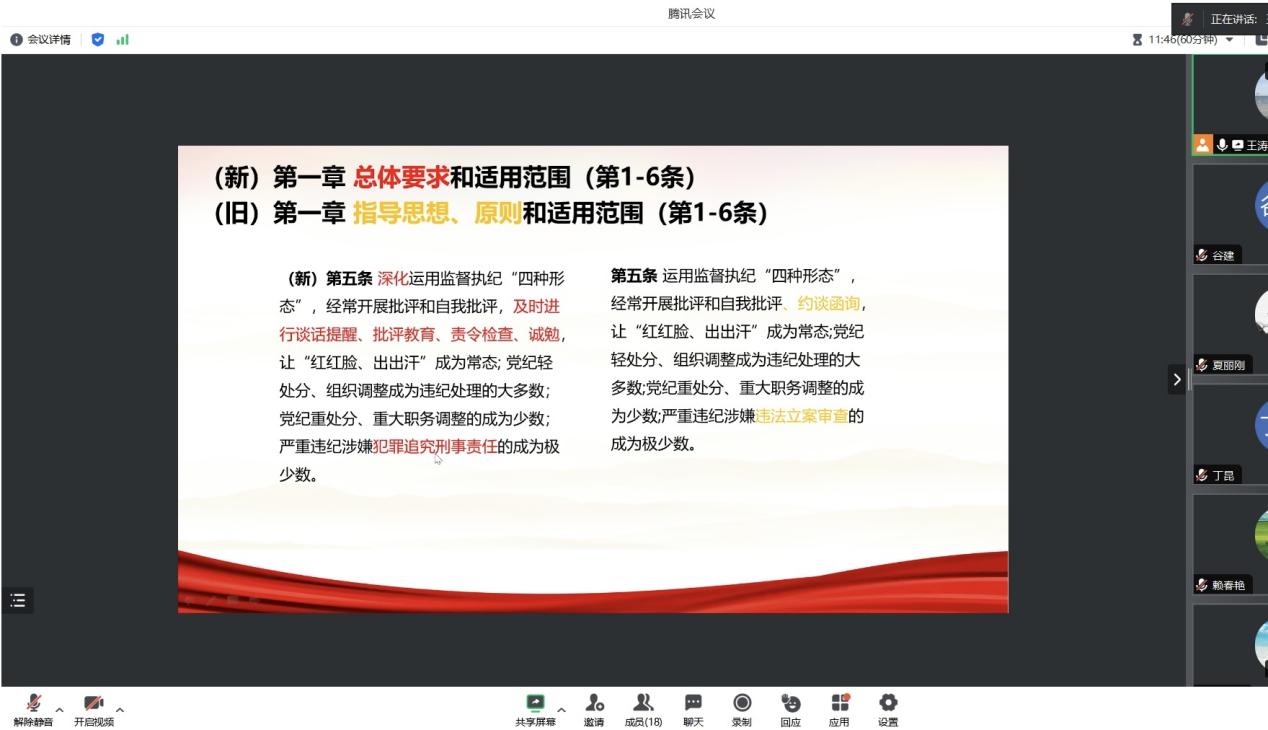 会上,闵宇霖传达公司对于本次理论学习的相关会议精神,要求团队成员认真学习,真正的把党纪学习教育入脑入心。团队联络员王涛就《中国共产党纪律处分条例》(1--7章)的内容包括:总体要求和适用范围、违纪与纪律处分、纪律处分运用规则、对违法犯罪党员的纪律处分、其他规定、对违反政治纪律行为的处分、对违反组织纪律行为的处分开展了逐字逐句、原原本本领学。团队成员就学习感悟在会上做了交流发言。随后,团队成员逐个汇报近期的研究成果进展。