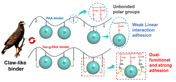 作者受自然界动物抓取物体的启发,设计制备了一种具有高离子电导率的爪型粘结剂。通过牛磺酸接枝的PAA粘合剂(Tau-g-PAA),以通过双极性基团(磺基和羧基)稳定纳米硅(SiNPs),牛磺酸(Tau)和聚丙烯酸(PAA)上的极性基团在硅颗粒表面产生“爪型协同效应”,赋予了硅负极强大的力学性能。结果表明,30Tau-g-PAA的离子电导率是常规PAA粘结剂的10倍以上。30Tau-g-PAA/Si电极还表现出更高的循环可逆容量和优异的倍率性能。本研究展示了一种与侧链磺化聚合物相结合来制备高性能小分子接枝粘结剂,对于储能电池性能的提升具有广阔的实际应用前景。