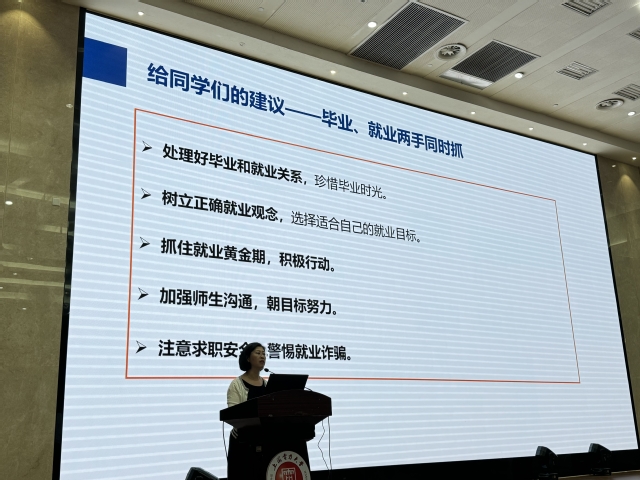 大会围绕“就业指导”与“就业动员”两大主题展开。在就业指导环节,闵宇霖对当前经济形势和就业形势进行了深入剖析,为同学们明确努力方向。他鼓励同学们要有清晰的职业规划,提前为未来打算,切不可眼高手低、好高骛远,亦不能漫不经心。同时,闵宇霖还针对研究生毕业论文撰写提出了宝贵的建议。