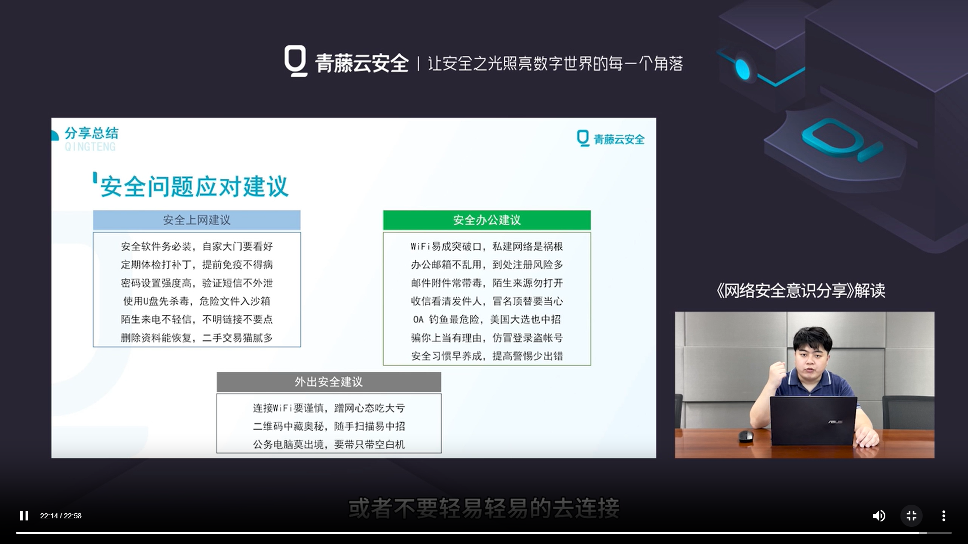 为深入学习贯彻党的二十大精神,贯彻落实习近平对网络安全和信息化工作作出的重要指示精神,近日,公司党委依托教师思政理论学习制度,组织全体教师集体学习视频课程《网络安全意识分享》,帮助广大教师提升网络安全法治素养和防护能力。