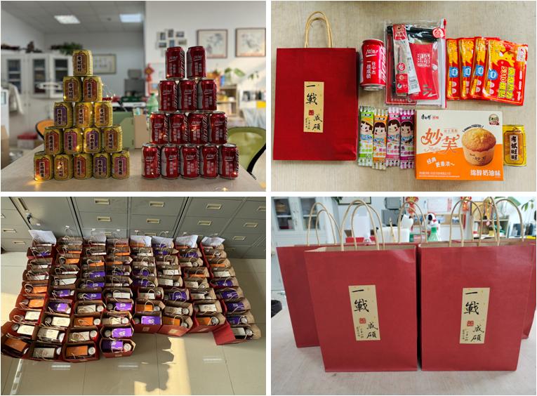 公司以同学们的实际需求为导向,悉心准备了考研大礼包。礼包内有考试必备的用品袋,还有能在冬日带来温暖的暖宝宝贴,甜蜜的棒棒糖、精致的小蛋糕,以及印有每位考研同学专属名字的“可乐”和寓意考试顺利的 “考试旺旺奶”。这些物品不仅承载着公司对同学们的深切关怀,更寄托了考研 “旺旺”、金 “棒” 题名的美好祈愿。